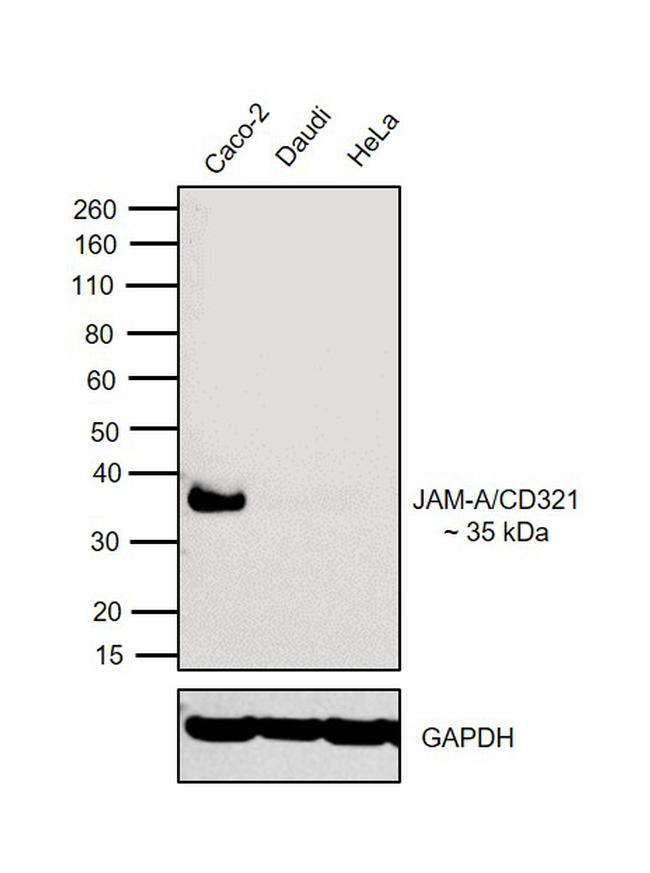 CD321 (F11R, JAM-1, JAM-A) is a cell-surface adhesion molecule belonging to the Ig superfamily of receptors. CD321 is a 32-41 kD glycoprotein, possessing two extracellular Ig-like domains, a transmembrane region, and a short cytosolic tail. The protein assembles at the membrane as a homodimer, and can associate laterally with other membrane proteins including integrins. CD321 is expressed on a variety of cell types, including leukocytes, platelets, erythrocytes, stem cells, epithelial and endothelial cells, and plays a role in mediating cell-cell contact. CD321 can be found in close proximity to several components of epithelial tight junctions, including ZO-1 and occludin. CD321 is involved in the maintenance of epithelial and endothelial barriers, hematopoiesis, angiogenesis, and tumor proliferation, invasion, and metastasis.