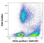 This antibody reacts with an extracellular epitope of CD41 (GPIIb), a transmembrane glycoprotein (integrin family) composed of two chains GPIIb alpha (heavy chain; 120 kDa) and GPIIb beta (light chain; 23 kDa). CD41 is mainly expressed on platelets and megakaryocytes.