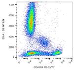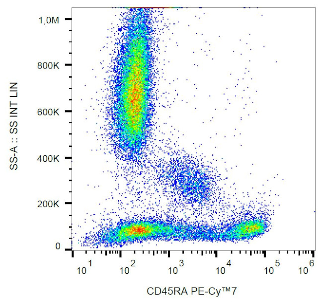 CD45RA is an isoform of the CD45 complex and has restricted expression between different subtypes of lymphoid cells. CD45 (LCA, leukocyte common antigen) is a receptor-type protein tyrosine phosphatase ubiquitously expressed in all nucleated hematopoietic cells, comprising approximately 10% of all surface proteins in lymphocytes. CD45 glycoprotein is crucial in lymphocyte development and antigen signaling, serving as an important regulator of Src-family kinases. CD45 protein exists as multiple isoforms as a result of alternative splicing and these isoforms differ in their extracellular domains, however, they share identical transmembrane and cytoplasmic domains. CD45 isoforms differ in their ability to translocate into the glycosphingolipid-enriched membrane domains and their expression depends on cell type and physiological state of the cell. Besides the role in immunoreceptor signaling, CD45 is important in promoting cell survival by modulating integrin-mediated signal transduction pathway and is also involved in DNA fragmentation during apoptosis. CD45 is expressed on cells of the human hematopoietic lineage, with the exception of mature red cells and is not detected on differentiated cells of other tissues. It is likely that CD45 plays an important role in signal transduction, inhibition or upregulation of various immunological functions. Diseases associated with CD45 dysfunction include severe combined immunodeficiency and Hepatitis C.