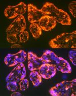 Immunohistochemistry (Immunofluorescence) analysis of CD49e (Integrin alpha 5) in human placenta. Samples were incubated with CD49e (Integrin alpha 5) Polyclonal antibody (Product # PA5-96530) using a dilution of 1:100. Blue: DAPI for nuclear staining. {{ $ctrl.currentElement.advancedVerification.fullName }} 验证信息 View more