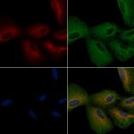 Immunocytochemistry analysis of DRD2 in A549 cells. Samples were treated with PFA, permeabilized in 0.1% Triton X-100, blocked in 10% serum (45 min at 25°C), and incubated with polyclonal antibody (Product # PA5-115142). Secondary staining was applied with mouse anti-beta tubulin (1 hr at 37°, AlexaFluor 594 conjugated goat anti-rabbit IgG (Red), AlexaFluor 488 conjugated goat anti-mouse IgG (Green) and DAPI. {{ $ctrl.currentElement.advancedVerification.fullName }} 验证信息 View more