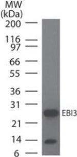 EBI3 (Epstein-Barr virus Induced-3) is a secreted glycoprotein of the hematopoietin receptor family. It plays a critical regulatory role in the induction of Th2-type immune responses and the development of Th2-mediated tissue inflammation in vivo, which may be mediated through the control of iNKT cell function. EBI3 dimerizes with p28 and p35 subunits of IL-12 to form new proteins IL-27 and IL-35, respectively. IL-27 is an early product of activated antigen presenting cell that is produced upon TLR ligation. It negatively regulates Th17 cell differentiation. EBI3 is widely expressed and its expression in dendritic cell is transcriptionally regulated by TLR signaling via MyD88 and NF-kappaB during innate immune responses preceding cytokine driven Th cell development. EBI3 signal inhibits delayed-type hypersensitivity responses by suppressing IL-17 production and inducing IL-10 hyperproduction. EBI3 may play a novel role in controlling tumor metastasis via lung CD8+ T cells, and its deficiency is associated with a diminished production of Th2 cytokines which are known to regulate allergic airway inflammation in asthma. Targeted deletion of EBI3 protects mice from lung metastasis.