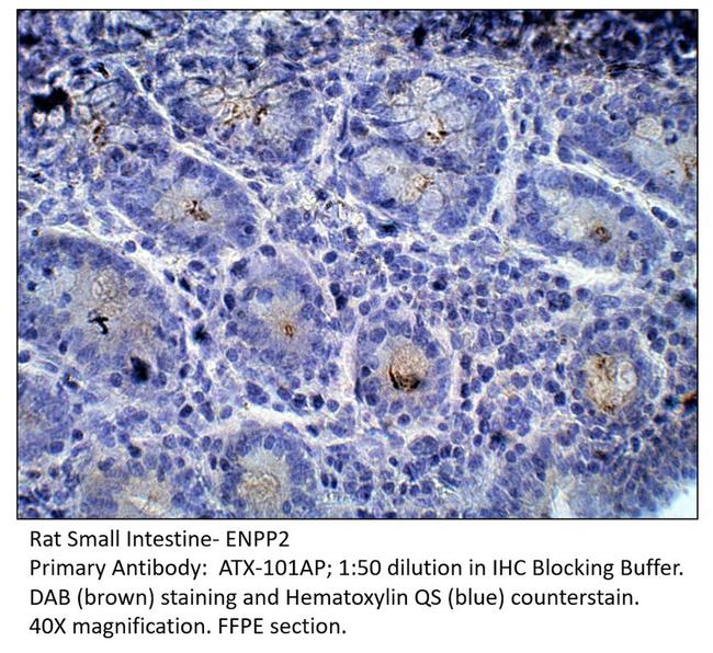 Rat Small Intestine- ENPP2 Primary Antibody: ATX-101AP; 1:50 dilution in IHC Blocking Buffer. DAB (brown) staining and Hematoxylin QS (blue) counterstain. 40X magnification. FFPE section. {{ $ctrl.currentElement.advancedVerification.fullName }} 验证信息 View more