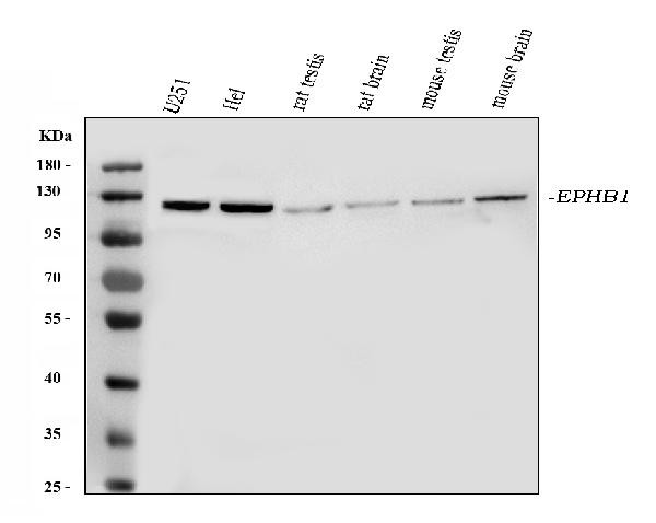 EPHB1 is a receptor tyrosine kinase that belongs to the ephrin receptor family. Members of the Eph family of kinases play important roles in diverse biological processes including nervous system development, angiogenesis and neural synapsis formation and maturation. EphB1 and other ephB family members are type 1 membrane spanning proteins, comprised of immunoglobulin, fibronectin type III, and cysteine rich subdomains in the ecto domain, and the single uninterrupted cytoplasmic tyrosine kinase domain upstream of a carboxyterminal sterile alpha motif (SAM) domain. ephB family proteins bind ephrins of the B class, ligands that are also transmembrane spanning proteins capable of transmitting signals. ephB1 is expressed predominantly in developing neural structures in embryos, and in vascular epithelium of kidney, and other tissues. Upon binding to alternatively oligomerized ephrin B1, ephB1 signals regulation of cell attachment and cellcell assembly. Members of this protein family are implicated in neuronal and vascular cell targeting.