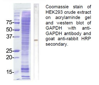 GAPDH (Glyceraldehyde-3-phosphate dehydrogenase) is a catalytic enzyme commonly known to be involved in glycolysis. GAPDH exists as a tetramer of identical 37-kDa subunits and catalyzes the reversible reduction of 1,3-bisphosphoglycerate to glyceraldehyde 3-phosphophate in the presence of NADPH. Apart from playing a key role in glycolysis, GAPDH is ubiquitously expressed and displays other activities unrelated to its glycolytic function. GAPDH is reported to be involved in the processes of DNA replication, DNA repair, nuclear RNA export, membrane fusion and microtubule bundling. Studies provide evidence of GAPDH playing an essential part in gene expression observed in apoptosis and as part of the cellular phenotype of age-related neurodegenerative diseases. Further, GAPDH is involved in other cellular processes ranging from membrane fusion, and neuronal apoptosis in cancer. GAPDH is reported to bind to a variety of other proteins, including the amyloid precursor protein, mutations in which cause some forms of Alzheimer's disease (AD), and the polyglutamine tracts of Huntingtin, the protein product aberrant forms of which are causative of Huntington's disease. Associations between GAPDH, actin and tubulin have also be reported. Since GAPDH is expressed at high levels in most tissues, it is useful as protein loading control in Western Blot analysis.