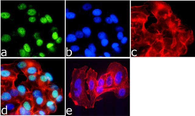 Immunofluorescence was performed on MCF7 cells treated with SAHA (0.5 uM/18 hours). These cells were permeabilized and fixed for detection of Histone H2BK15ac using Anti-Histone H2BK15ac Recombinant Rabbit Monoclonal Antibody (Product # 701799, 1 µg/mL) and labeled with Goat anti-Rabbit IgG (Heavy Chain) Superclonal Secondary Antibody, Alexa Fluor® 488 conjugate (Product # A27034, 0.4 µg/mL, 1:2500). Panel a) shows representative cells that were stained for detection and localization of Histone H2BK15ac protein (green), Panel b) is stained... View More {{ $ctrl.currentElement.advancedVerification.fullName }} 验证信息 View more
