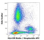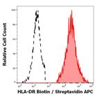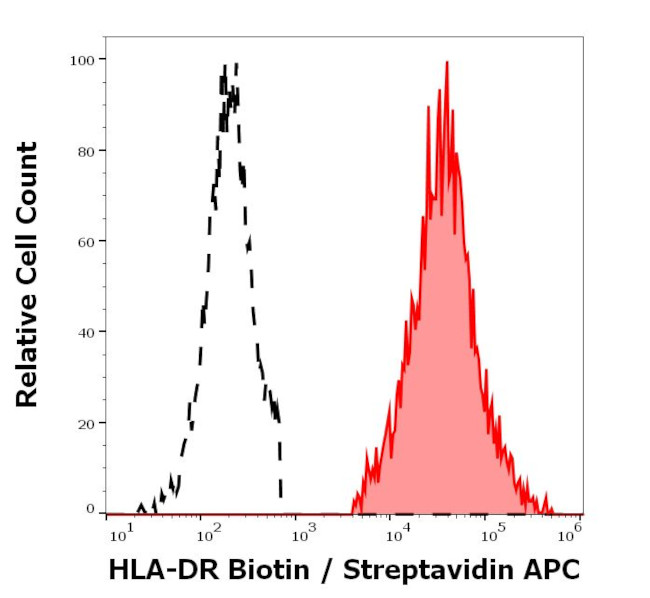 HLA-DR, like other MHC class II molecules, is a transmembrane glycoprotein composed of a 36 kDa alpha chain (DRA) and 27 kDa beta chain (DRB). The alpha chain gene contains 5 exons. Exon 1 encodes the leader peptide, exons 2 and 3 encode the two extracellular domains, and exon 4 encodes the transmembrane domain and the cytoplasmic tail. DRA does not have polymorphisms in the peptide binding part and acts as the sole alpha chain for DRB1, DRB3, DRB4 and DRB5. Within the DR molecule the beta chain contains all the polymorphisms specifying the peptide binding specificities. Hundreds of DRB1 alleles have been described and typing for these polymorphisms is routinely done for bone marrow and kidney transplantation. HLA-DR is expressed primarily on antigen presenting cells such as B lymphocytes, monocytes, macrophages, thymic epithelial cells and activated T lymphocytes. Three loci, DR, DQ and DP, encode the major expressed products of the human class II region. The human MHC class II molecules bind intracellularly processed peptides, present them to T-helper cells, and have a critical role in the initiation of the immune response.