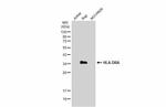 HLA-DRA is one of the HLA class II alpha chain paralogues. This class II molecule is a heterodimer consisting of an alpha and a beta chain, both anchored in the membrane. It plays a central role in the immune system by presenting peptides derived from extracellular proteins. Class II molecules are expressed in antigen presenting cells (APC: B lymphocytes, dendritic cells, macrophages). The alpha chain is approximately 33-35 kDa and its gene contains 5 exons. Exon 1 encodes the leader peptide, exons 2 and 3 encode the two extracellular domains, and exon 4 encodes the transmembrane domain and the cytoplasmic tail. DRA does not have polymorphisms in the peptide binding part and acts as the sole alpha chain for DRB1, DRB3, DRB4 and DRB5.