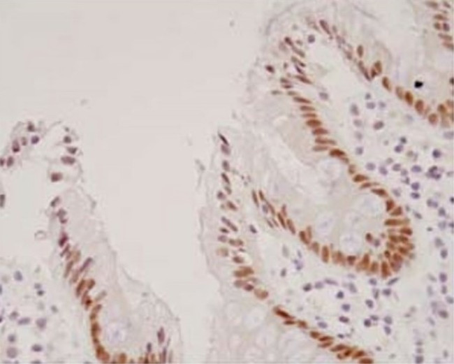 Immunohistochemistry analysis of HNF4 alpha7 in paraffin-embedded human large intestine. The sample was incubated in HNF4 alpha7 monoclonal antibody (Product # 417800) at a dilution of 3 μg/mL. Section was fixed with 10% formalin-fixed in immersion, activated by autoclave at 121°C for 15 minutes, and blocked with 3% H2O2 in methanol. {{ $ctrl.currentElement.advancedVerification.fullName }} 验证信息 View more