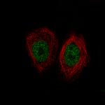 Immunofluorecent analysis of KDM5B in MCF7 cells using KDM5B Monoclonal Antibody (CL1129) (Product # MA5-24626). Staining shows specific staining in the nucleoplasm in green. Microtubule- and nuclear probes are visualized in red and blue, respectively (where available). {{ $ctrl.currentElement.advancedVerification.fullName }} 验证信息 View more
