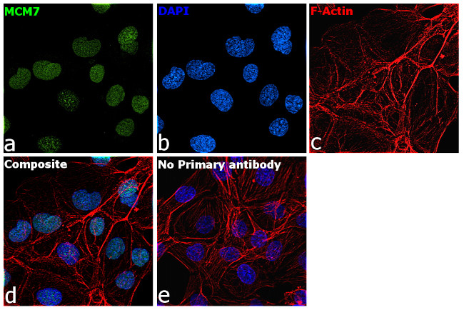 MCM7 encodes a protein that is one of the highly conserved mini-chromosome maintenance proteins (MCM) that are essential for the initiation of eukaryotic genome replication. The hexameric protein complex formed by the MCM proteins is a key component of the pre-replication complex (pre_RC) and may be involved in the formation of replication forks and in the recruitment of other DNA replication related proteins. The MCM complex consisting of this protein and MCM2, 4 and 6 proteins possesses DNA helicase activity, and may act as a DNA unwinding enzyme.The protein encoded by this gene is one of the highly conserved mini-chromosome maintenance proteins (MCM) that are essential for the initiation of eukaryotic genome replication. The hexameric protein complex formed by the MCM proteins is a key component of the pre-replication complex (pre_RC) and may be involved in the formation of replication forks and in the recruitment of other DNA replication related proteins. The MCM complex consisting of this protein and MCM2, 4 and 6 proteins possesses DNA helicase activity, and may act as a DNA unwinding enzyme. Cyclin D1-dependent kinase, CDK4, is found to associate with this protein, and may regulate the binding of this protein with the tumorsuppressor protein RB1/RB. Alternatively spliced transcript variants encoding distinct isoforms have been reported.