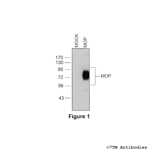 Validation of the mu -Opioid Receptor in transfected HEK293 cells. Native HEK293 cells (MOCK) or HEK293 cells stably expressing the mu -Opioid Receptor (MOP) were lysed and immunoblotted with the phosphorylation-independent anti-MOP antibody (7TM0319N-WB) at a dilution of 1:1,000. {{ $ctrl.currentElement.advancedVerification.fullName }} 验证信息 View more