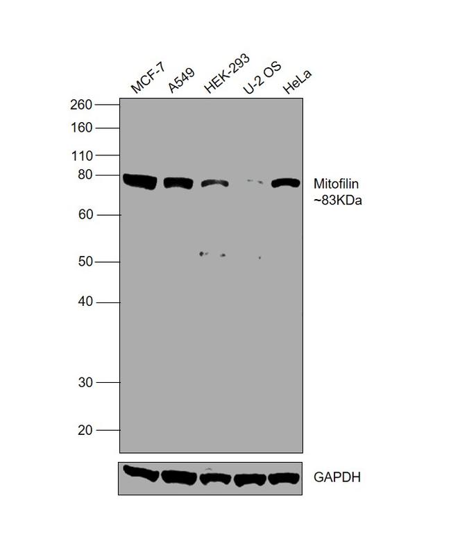 Mitofilin is a transmembrane protein of the inner mitochondrial membrane and it is associated with a large multimeric protein complex of about 1200 kDa. Mitofilin has critical functions in mitochondrial morphology and mitochondrial fusion and fission, specifically in the formation of tubular cristae and cristae junctions. Abnormal mitochondrial morphology has been implicated in many human diseases such as myopathy, cardiomyopathy, rhabdomyosarcoma and Whartin's tumor.
