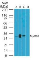 Myeloid differentiation Marker 88 (MyD88) is an adaptor molecule for the Toll/IL-1R and is involved in the inflammatory response induced by IL-1, IL-18 and LPS. MyD88 recruits IRAK to IL-1 receptor complex in response to IL-1. This pathway further leads to activation of NF-kB. MyD88 has a wide tissue distribution.