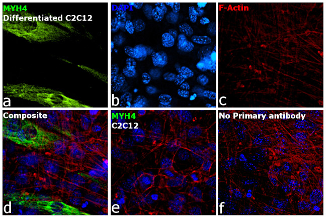 Description: This MF20 monoclonal antibody recognizes the heavy chain of myosin II, specificially the light meromyosin portion, in cardiac and skeletal muscle of vertebrates. Myosin II is composed of two heavy chains and four light chains. The 220-kDa myosin heavy chain exists as four different isoforms due to alternative splicing. Myosins interact with actin and hydrolyze ATP to function in muscle contraction, cytokinesis, and phagocytosis.