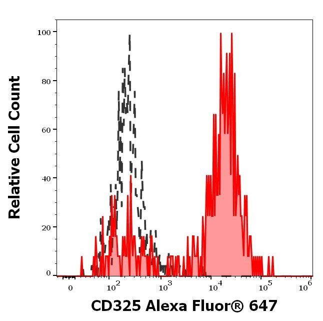 Flow cytometry (surface staining) of N-cadherin in HeLa cells. Samples were stained with N-cadherin monoclonal antibody (Product # MA562293) using a dilution of 5 µg/mL. Separation of stained HeLa cells (red-filled) from HeLa cells stained using mouse IgG1 isotype control (MOPC-21) Alexa Fluor® 647 antibody (5 µg/mL, black-dashed). {{ $ctrl.currentElement.advancedVerification.fullName }} 验证信息 View more