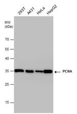 PCNA (polymerase delta auxiliary protein) is essential for DNA replication and is involved in DNA excision and mismatch repair pathways. PCNA binds to the CDK inhibitor p21, the structure-specific endonucleases Fen1 and XPG, and DNA cytosine 5-methyltransferase (MCMT). PCNA is a potentially useful marker of cells with proliferative potential and for identifying the proliferation status of tumor tissue (i.e. relevant to prognosis). PCNA is a marker for cells in early G1 phase and S phase of the cell cycle. PCNA is found in the nucleus and is a cofactor of DNA polymerase delta, and acts as a homotrimer and helps increase the processing of leading strand synthesis during DNA replication. In response to DNA damage, PCNA is ubiquitinated and is involved in the RAD6-dependent DNA repair pathway. Two transcript variants encoding the same protein have been found for PCNA. Pseudogenes of PCNA have been described on chromosome 4 and on the X chromosome.