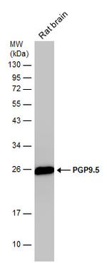 PGP9.5 (Protein gene product 9.5, UCH-L1, PARK5) is a neuron specific protein, structurally and immunologically distinct from neuron specific enolase. PGP9.5 has a molecular weight of 27 kDa and was first identified by high resolution two dimensional PAGE. PGP9.5 is a member of ubiquitin carboxyl-terminal hydrolase family 1 (peptidase family C12) with a ubiquitin carboxyl-terminal hydrolase domain. PGP9.5 is well known for having ubiquitin hydrolase and ligase activities that hydrolyzes small C-terminal adducts of ubiquitin to generate ubiquitin monomers. PGP9.5 is present in neurons and nerve fibers at all levels of the central and peripheral nervous system, in neuroendocrine cells, in segments of the renal tubules, in spermatogonia and Leydig cells of the testis, in ova and in some cells of both the pregnant and non-pregnant corpus luteum. Over expression of PGP9.5 leads to non-small cell lung cancer while decreased expression leads to Huntington disease and Alzheimer disease. Since PGP9.5 is present in cellular inclusions, it can be a useful as a neuronal marker and in the studies of neurodegenerative disorders such as with Parkinson disease.