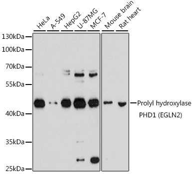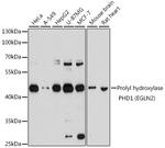 Western blot analysis of PHD1 in extracts of various cell lines. Samples were incubated with PHD1 Polyclonal antibody (Product # PA5-96102) using a dilution of 1:1,000, followed by HRP Goat Anti-Rabbit IgG (H+L) at a dilution of 1:10,000. Lysates/proteins: 25 µg per lane. Blocking buffer: 3% nonfat dry milk in TBST. Detection: ECL Basic Kit. Exposure time: 30s. {{ $ctrl.currentElement.advancedVerification.fullName }} 验证信息 View more