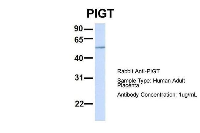 Western blot analysis of human adult placenta cells using an anti-PIGT polyclonal antibody (Product # PA5-42992). {{ $ctrl.currentElement.advancedVerification.fullName }} 验证信息 View more