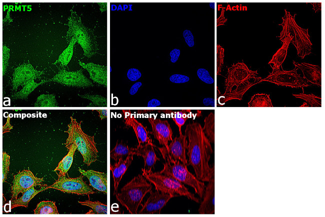 PRMT5 (protein arginine N-methyltransferase 5) is an arginine methyltransferase that can both catalyze the formation of omega-N monomethylarginine (MMA) and symmetrical dimethylarginine (sDMA), with a preference for the formation of MMA. PRMT5 specifically mediates the symmetrical dimethylation of arginine residues in the small nuclear ribonucleoproteins Sm D1 and Sm D3; such methylation is required for the assembly and biogenesis of snRNP core particles.
