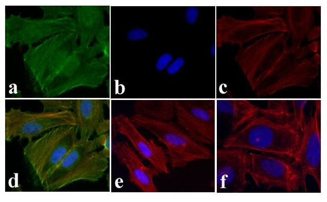 Immunofluorescence analysis of EGFR (pY1173) was done on 70% confluent log phase HeLa cells treated with EGF (200 ng/mL for 10 min). The cells were fixed with 4% paraformaldehyde for 15 minutes, permeabilized with 0.25% Triton™ X-100 for 10 minutes, and blocked with 5% BSA for 1 hour at room temperature. The cells were labeled with EGFR (pY1173) Rabbit polyclonal Antibody (Product # 44-794G) at 2 µg/mL in 1... View More {{ $ctrl.currentElement.advancedVerification.fullName }} 验证信息 View more