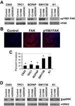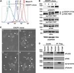 Focal Adhesion Kinase (FAK) is a 125 kDa non-receptor protein tyrosine kinase that acts as a substrate for Src and is a key element of integrin signaling. FAK plays an important role in cell spreading, differentiation, migration, cell death, and acceleration of the G1 to S phase transition of the cell cycle. FAK has a central catalytic domain and a C-terminal tail that localizes it to focal adhesions, which are sites where cells attach to the extracellular matrix via surface integrin receptors. Increased FAK tyrosine phosphorylation occurs upon integrin engagement with fibronectin. Adhesion of murine NIH3T3 fibroblasts to fibronectin promotes association of the Grb2 adapter protein and c-Src PTK with FAK in vivo, and also results in activation of the ERK2 MAP kinase. In v-Src-transformed NIH3T3, the association of v-Src, Grb2, and Sos with FAK is independent of cell adhesion to fibronectin. In vitro the Grb2 SH2 domain binds directly to tyrosine-phosphorylated FAK, and the binding site has been identified as Tyr925 by site directed mutagenesis. Several transcript variants encoding different isoforms have been found for the FAK gene, but the full-length natures of only three of them have been determined.