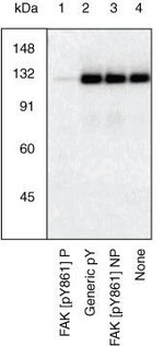 The antibody has been negatively preadsorbed using a non-phosphopeptide corresponding to the site of phosphorylation to remove antibody that is reactive with non-phosphorylated FAK. The final product is generated by affinity chromatography using a FAK-derived peptide that is phosphorylated at tyrosine 861.