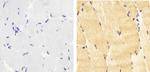 Immunohistochemistry analysis of Phospho-IRS1 (pY612) showing staining in the cytoplasm and nucleus of paraffin-embedded human skeletal muscle tissue (right) compared to a negative control without primary antibody (left). To expose target proteins, antigen retrieval was performed using 10mM sodium citrate (pH 6.0), microwaved for 8-15 min. Following antigen retrieval, tissues were blocked in 3% H2O2-methano... View More {{ $ctrl.currentElement.advancedVerification.fullName }} 验证信息 View more