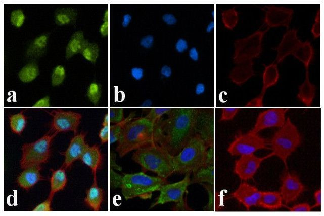 Immunofluorescent analysis of JNK1/2 (pT183/pT185) was done on 70% confluent log phase A549 cells treated with Anisomycin (25 µg/mL for 30 min). The cells were fixed with 4% paraformaldehyde for 15 minutes, permeabilized with 0.25% Triton™ X-100 for 10 minutes, and blocked with 5% BSA for 1 hour at room temperature. The cells were labeled with JNK1/2 (pT183/pT185) Rabbit polyclonal Antibody (Product # 44-68... View More {{ $ctrl.currentElement.advancedVerification.fullName }} 验证信息 View more