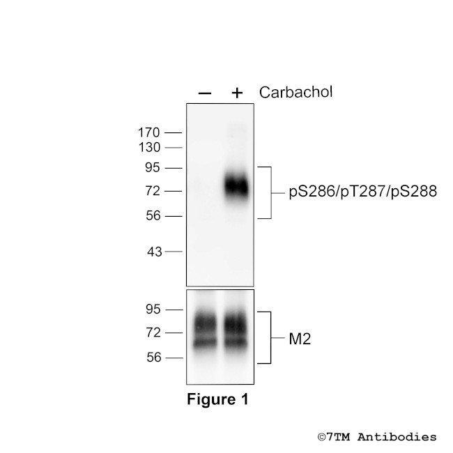 Agonist-induced Serine286/Threonine287/Serine288 phosphorylation of the M2 Muscarinic Acetylcholine Receptor. Upper panel, HEK293 cells stably expressing the 5-Hydroxytryptamine Receptor 4 (M2) were either not exposed or exposed to 100 µM carbachol for 30 minutes. Cells were lysed and immunoblotted with the anti-pS286/pT287/pS288-M2 antibody (7TM0014C) at a dilution of 1:1,000. Lower panel, blot was strippe... View More {{ $ctrl.currentElement.advancedVerification.fullName }} 验证信息 View more