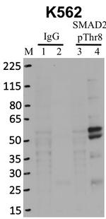 SMAD2 (MADH2, MAD2) regulates multiple cellular processes, such as cell proliferation, apoptosis, and differentiation. SMAD2 interacts with the TGF-beta receptors through its interaction with the SMAD anchor for receptor activation into the nucleus is a central event in TGF beta signaling. Phosphorylation of threonine 8 in the calmodulin-binding region of the MH1 domain by extracellular signal regulated kinase 1 (ERK1) enhances SMAD2 transcriptional activity, which is negatively regulated by calmodulin. In response to the TGF-beta signal, SMAD2 is phosphorylated by the TGF-beta receptors. The phosphorylation induces the dissociation of this protein with SARA and the association with the family member SMAD4. The association with SMAD4 is important for the translocation of this protein into the nucleus, where it binds to target promoters and forms a transcription repressor complex with other cofactors. SMAD2 can also be phosphorylated by activin type 1 receptor kinase, and mediates the signal from the activin. Alternatively spliced transcript variants encoding the SMAD2 protein have been observed.