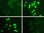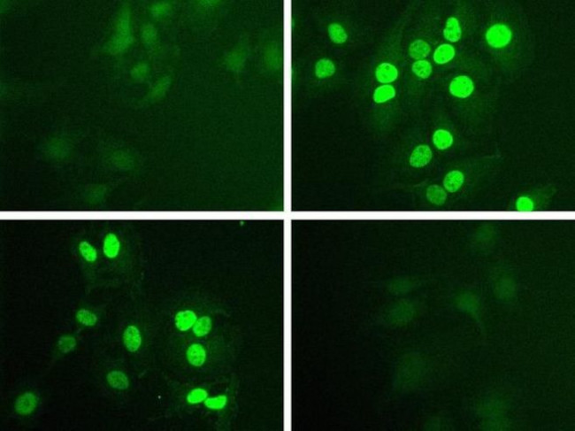 Immunofluorescent analysis of Phospho-STAT1 pTyr701 in HeLa cells stimulated with 100 ng/mL IFN-gamma (top right) or unstimulated (top left) using a Phospho-STAT1 pTyr701 recombinant rabbit monoclonal antibody (Product # 700349) at a dilution of 1 µg/mL preincubated with the phosphopeptide used as an immunogen (bottom right) or with non-phosphopeptide (bottom left), followed by detection using an Alexa Fluo... View More {{ $ctrl.currentElement.advancedVerification.fullName }} 验证信息 View more