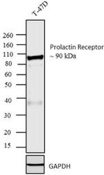 This antibody is predicted to react with mouse and rat and reacts with the long form of the human prolactin receptor (hPRLr) protein at ~85-90 kDa, and may also identify the human prolactin receptor intermediate and delta S1 isoforms by western blotting. On immunoprecipitation, this antibody strongly recognizes only the long form of hPRLr. During development reactivity was confirmed with human T-47D breast carcinoma cells.