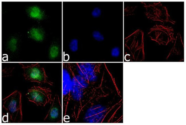 For immunofluorescence analysis, HeLa cells were fixed and permeabilized for detection of endogenous CSL/ RBP J using CSL/RBP J Rabbit Polyclonal Antibody (Product # 720219, 2 µg/mL) and labeled with Goat anti-Rabbit IgG (Heavy Chain) Superclonal Secondary Antibody, Alexa Fluor® 488 conjugate (Product # A27034, 1:2000). Panel a) shows representative cells that were stained for detection and localization of CSL/ RBP J protein (green), Panel b) is stained for nuclei (blue) using SlowFade® Gold Antifade Mountant with DAPI (Product # S36938). ... View More {{ $ctrl.currentElement.advancedVerification.fullName }} 验证信息 View more