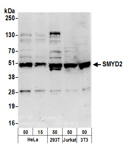 Detection of human and mouse SMYD2 by western blot. Samples: Whole cell lysate (50 & 15 µg) from HeLa, (50 µg) from HEK293T, Jurkat, and mouse NIH 3T3 cells prepared using NETN lysis buffer. Antibody: Affinity purified rabbit anti-SMYD2 antibody (Product # A303-011A) (lot A303-011A-2) used for WB at 0.1 µg/mL. Detection: Chemiluminescence with an exposure time of 3 minutes. {{ $ctrl.currentElement.advancedVerification.fullName }} 验证信息 View more
