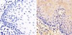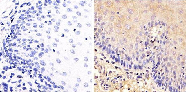 Immunohistochemistry analysis of SRC showing staining in the cytoplasm of paraffin-embedded human esophagus tissue (right) compared to a negative control without primary antibody (left). To expose target proteins, antigen retrieval was performed using 10mM sodium citrate (pH 6.0), microwaved for 8-15 min. Following antigen retrieval, tissues were blocked in 3% H2O2-methanol for 15 min at room temperature, w... View More {{ $ctrl.currentElement.advancedVerification.fullName }} 验证信息 View more