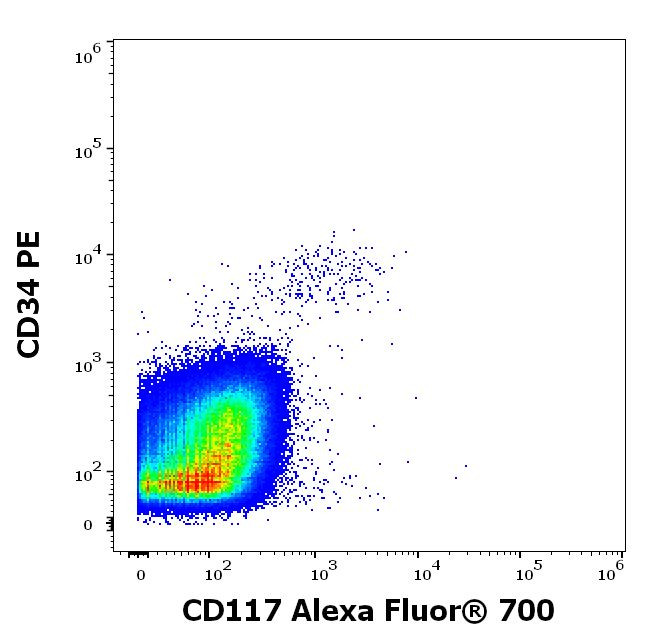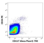 Flow cytometry (multicolor surface staining) of c-Kit in human leukocytes. Samples were stained with c-Kit monoclonal antibody (Product # MA562186) using a dilution of 4 µL reagent/100 µL of peripheral whole blood with anti-human CD34 (581) PE antibody at 20 µL reagent/100 µL of peripheral whole blood. {{ $ctrl.currentElement.advancedVerification.fullName }} 验证信息 View more