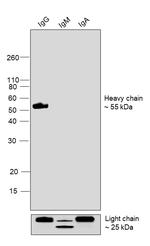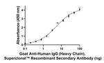 This Goat-anti-Human IgG (Heavy Chain), Superclonal Recombinant Secondary Antibody specifically detects human IgG Heavy chain with no cross-reactivity to light chain and other species immunoglobulins except moderate cross-reactivity towards Monkey IgG.