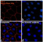 Immunofluorescence analysis of Goat anti-Rabbit IgG Fc, Cross Adsorbed Secondary Antibody, Alexa Fluor™ 594 (Product # A78956, 1:2,000 dilution) was performed on fixed and permeabilized HeLa cells stained with HSP90 alpha Polyclonal Antibody (Product # PA3-013, 1:2,000 dilution). Panel a) shows representative cells that were stained for detection and localization of HSP90 protein, Panel b) is stained for nu... View More {{ $ctrl.currentElement.advancedVerification.fullName }} 验证信息 View more