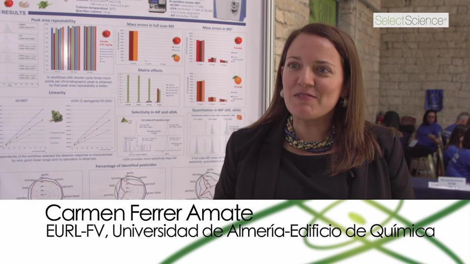 In this video, Carmen Ferrer Amate, EURL-FV, Universidad de Almería-Edificio de Química, explains why high resolution mass spectrometry is a highly selective and reliable technique that can be used to screen difficult matrices, like fruit and vegetable samples that have many components.