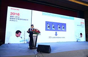 Oncomine cfDNA 肺癌研究试剂盒的产品经理Thomas Bittick发表了《创新的NGS液体活检技术用于检测低频肿瘤突变》的主题演讲,先介绍了液体活检和实体瘤检测的差异,引出基于NGS Ion 半导体高通量测序平台的液体活检解决方案,2天的时间内可完成从血浆样本到用药建议报告的完整流程。他还详细介绍了研发时我们的研发团队做过非常多细致严谨的验证工作和分享了欧洲和美国用户的体验。