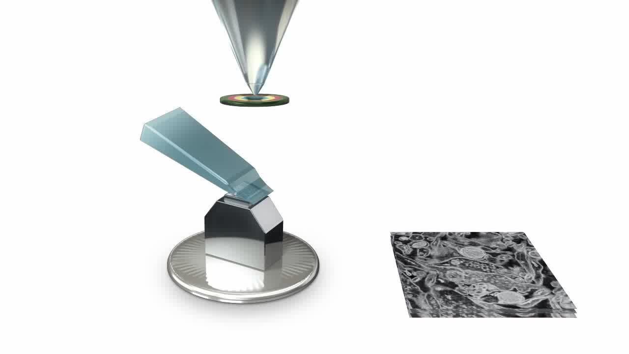 在连续切面成像过程中,电子束首先用于扫描树脂包埋组织样本的表面,捕获样本的 2D 图像。