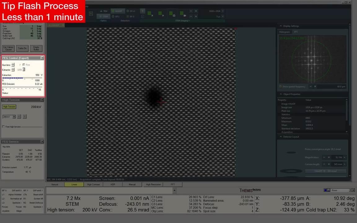 与所有冷场发射源一样,尖锐的尖端需要周期性再生(称为 flashing)以维持探针电流。使用 X-CFEG,尖端每个工作日只需 flashing 一次,这个过程不到一分钟。即使在最高分辨率成像条件下,对探针像差也没有可测量的影响,并且每日尖端 flashing 过程对尖端寿命没有影响。