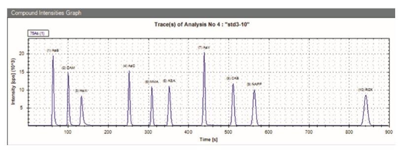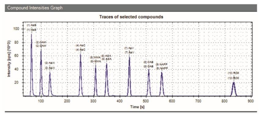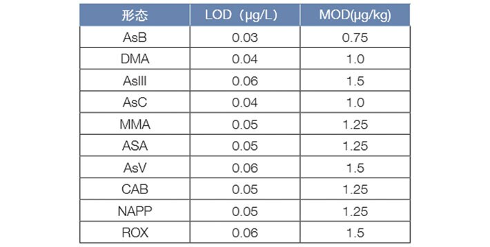 由图表可知,IC-ICPMS方案对于10种砷形态分离效果好,灵敏度高,且能在15min完成10种砷的快速准确分析,提高实验室效率,降低分析成本,是值得实验室投资的一种高效可行的分析动物源性食品中砷形态的解决方案。