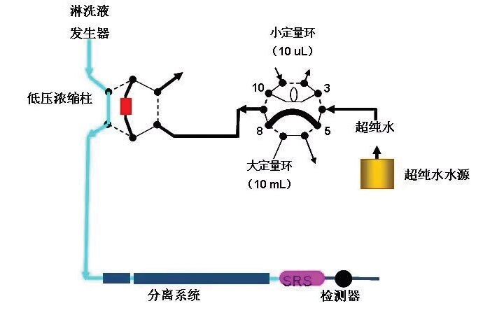 通过淋洗液发生器配合双阀切换在线浓缩装置,淋洗液发生器产生的KOH经过抑制后,产物是水,比碳酸盐体系具有较低的背景电导,所以具有更高的检测灵敏度;而通过在线富集,可以实现超大体积进样,得到更低的检测下限。
