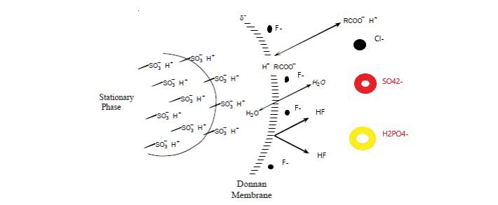 上图说明了二维离子色谱对电子级氢氟酸基体去除的原理。电子级氢氟酸中大量的氟离子被吸附在离子排斥柱Dionex IonPac ICE-AS6的Donnan膜上,而其他强酸和中强酸的酸根,则先一步流出离子排斥柱,进入到二维离子分析柱中进行分离和测定。整个过程只用超纯水作为流动相,使得电子级氢氟酸中的高氟基体得到很好地去除。