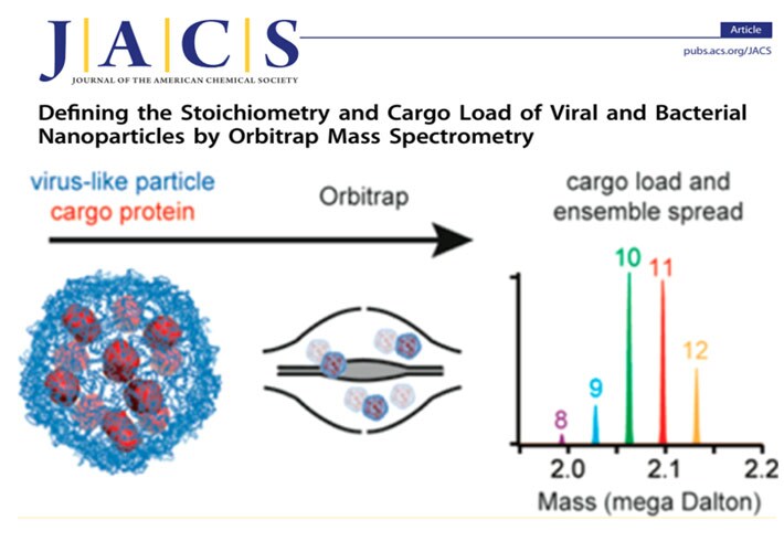 准确的质量分析为研究病毒的蛋白组装过程提供重要的信息,本文使用Orbitrap高分辨质谱仪测定高达4.5MDa病毒样颗粒,并精准检测装载8至12种蛋白后的细菌胶囊颗粒的分子量,确定加载蛋白的具体数目。此外利用Native MS技术确定腺相关病毒衣壳蛋白的三种不同剪接变体的未知化学计量,表明对称性被破坏且病毒装配过程具有异质和随机性。这些结果证明Orbitrap高分辨质谱在基于蛋白质的纳米颗粒分析中的强大能力及在化学生物学和纳米技术中的广泛应用。