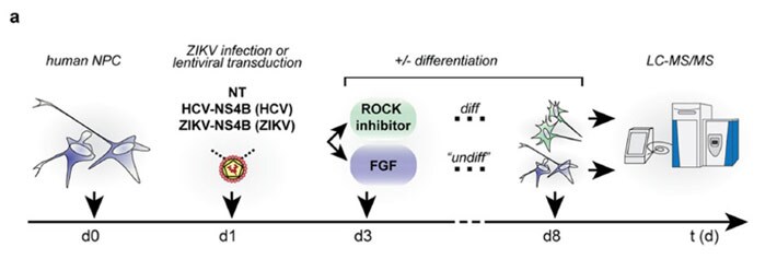 技术路线:利用赛默飞 LTQ-Orbitrap和Orbitrap Q Exactive HF质谱进行全蛋白质组学和修饰蛋白质组学(实验路线见下图a),研究对象为神经细胞系SK-N-BE2和NPC细胞,表征细胞对病毒的反应,在蛋白质组和磷酸化蛋白质组水平上的变化,利用亲和蛋白组学方法鉴定ZIKV蛋白的细胞靶点。使用这种方法,找到了386个与zikv相互作用的蛋白质,导致宿主在神经发育受损,视网膜缺陷和不孕。此外,确定了寨卡病毒感染后1216个磷酸化位点存在上调或下调,来自AKT, MAPK-ERK和ATM-ATR信号通路中,为防范ZIKV感染扩散提供机制基础。在功能上,系统地理解了ZIKV诱导后的宿主的蛋白质和细胞通路水平的扰动,并对感染后细胞施加Rock抑制剂药物干预,利用非标定量蛋白质组学方法分析差异蛋白进行验证(下图热图),补充这一空白。