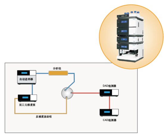 所有基于雾化原理的检测器(如CAD,ELSD),其响应值均会随流动相中有机相比例的变化而变化,通过双三元液相色谱系统的反梯度补偿技术,可以使流动相组成保持不变,从而使相同含量的组分具有更加趋于一致的响应。电雾式检测器(Charged Aerosol Detector, CAD)为赛默飞独有的一种新型质量通用型检测器,可用于分析无(或弱)紫外吸收的不(半)挥发性成分。可对分析物提供独立于化学结构的一致的响应,无需复杂的优化即可得到可预见的结果。在药物杂质分析和天然药物多组分定量分析中,经常无法获得所有物质的对照品,却需要对所有物质进行定量或半定量分析,CAD检测器则可以解决这个难题,它可以在只有其中一种对照品的情况下实现对其他组分的定量或半定量分析。如果您配备了双三元液相色谱系统,在梯度分析过程中就可以进行反梯度程序进行柱后梯度补偿,从而可在整个梯度范围内获得一致的响应,使分析结果更加准确。